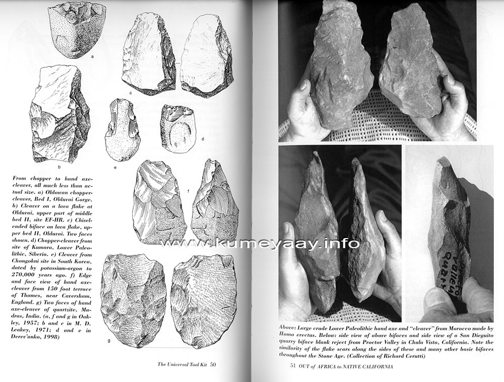 PREFACE: From the earliest Stone Age in Africa to 20th century California, our ancestors smashed rock to make tools. The tools from broken stones formed a kit surprisingly similar the world over. Elements of that kit live on today in remote corners of the globe among people close to the earth. The most important survival kit ever invented, it altered the very shape of human species and for millions of years was truly a universal tool kit. Despite its universality, especially among hunter-gather bands, it often goes unrecognized in the archaeological record. The kit is all but invisible. These are not the pretty points of museum show cases. Habitually these tools were simply found or made on the spot, used and discarded. The cubicle-bound mentality of the vicarious age finds difficult to imagine that for millions of years our genus survived in an untamed world with simple expedient stone tools. We invented the kit but then the kit made us, dramatically transformed us into who we are, physically and socially. We are inextricably linked to this kit. With this equipment, should we be left without modern technology today, without steel knives, hatchets and the endless cleaver gimmickry of modern survival technologists, we could still survive in the wild almost anywhere. And we could do it without anything. Because, at the bottom, the kit does not consist of stone tools. It does not consist of concrete pieces we must lug along the Australian Alborgine made from a rock at his feet the tool he needed, left it and went on. The kit weighs nothing. The kit is carried in the mind.... The pictures and writing in this section are parts of Paul Campbell's newest book: