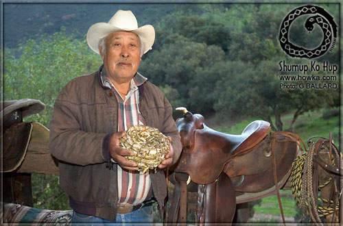 Jose Chi weaves willow acorn storage baskets. His grandfather was a Chinese immigrant and his grandmother was Paipai.