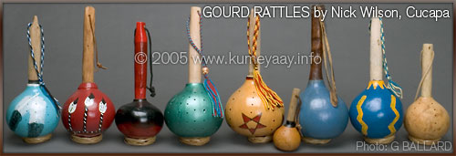 Nick Wilson, Cucapá, of Pozo de Arvisu Cocopah Indian Community, Sonora, Mexico, is a famous ethnographic artist for handcrafting traditional gourd rattles, peon sets, war clubs, bow & arrows, lances, willow bark skirts, baby cradles, and games in the ageless traditional Native California ways.