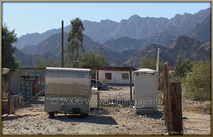 CUCAPA MOUNTAINS COCOPAHThe very distinctive Cucapa mountains of the aboriginal Native American Cocopah Indian territory, a Yuman speaking Indian nation indigenous to Southern California, southwest Arizona, and northern Baja California, Mexico, are pictured here from the Mexican tribal village of El Mayor. INDIAN HOUSING Rural Mexican Tribal VillageThe 2004 photograph documents Cocopah homes Indian housing in Mexico, including an old trailer, two brick structures, and two outhouses, one modern plastic and one traditional wooden. This Cocopah video JPEG was originally digitally photographed for a Kalim Smith UCSD multimedia DVD movie documentary, "Right of Passage, A Nation Divided." |