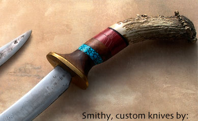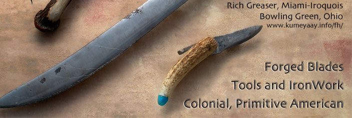 | Blacksmithing, Forged Heart, Custom Knives, Tools, Ironwork, Rich Greaser, Smithy, Miami-Iroquois Native American, Bowling Green, Ohio. Rustic forged colonial primitive blades, knifemaker, smithy for movie props, 1700s, 1800s, 1900s. Natural handles include elk horn, whitetail deer antler, animal bone, curly maple, oak and walnut. Available and custom made to order, photos gallery. | |||||||||