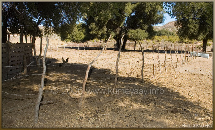 INDIAN RANCHES RANCHOS INDIOSThe Aldama "Rancho Tipai" is a real working Kumiai ranchos indios in the remote mountains of La Huerta, Baja California, Mexico. As seen in this ranch picture, the Aldama property is very clean and well kept. Note the large Indian oak trees and homemade custom fences handmade out of barbed wire and tree branches sticks. |
