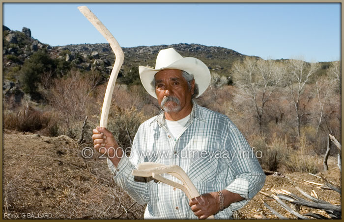 RABBIT STICKSGERARLDO ALDAMA SR, Kumeyaay Indian elder and Native American rancher is pictured on his working ranch Rancho Tipai holding primitive oak RABBIT STICKS he made in the ancient Kumeyaay way for sale across the US-Mexico border. Gerarldo was born and raised on Rancho Tipai and his Kumiai family has lived on the ranch for as long as he remembers. He says he speaks fluent Kumeyaay language as naturally as he speaks Spanish. As an authority on aboriginal survival knowledge, MR. ALDAMA is featured in the rabbit sticks chapter of Paul D. Campbell book: