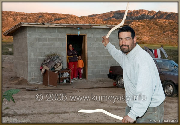 RabbitStick Primitive Hunting WeaponGERARLDO ALDAMA JR, Kumeyaay Indian, strikes a pose for the camera holding two primitive Kumeyaay rabbitsticks he made by hand as his wife and children look on from their Kumeyaay home in La Huerta, Baja Calif. Geraldo Aldama makes his primitive Indian hunting weapons out of local oak trees in the traditional Yuman Indian style that he learned from his father. |