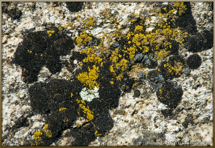 ROCK LICHENS FungiYellow and black lichens (Acarospora chlorophana) photograph pictures a closeup of rock fungus fungi on granite rocks boulders in the San Diego mountains, Los Coyotes Indian Reservation at around 5,500 feet. The close up photo switches to include more of the granite boulder if you move your mouse over the fungi. |