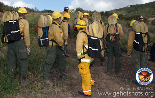 Fire-fighting students with heavy hose packs on their backs listened up to Captain Hopkins went over the plan just before they raced up the mountain laying hose the young man in the center with the fresh yellow uniform was a visiting Explorer, La Mesa Fire Dept.