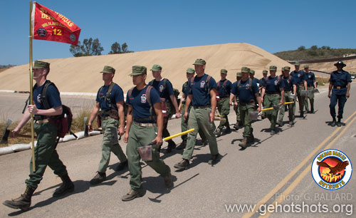 THE "DIRTY DOZEN" BIA-Sycuan Fire and Aviation Academy #12 marches in formation, 0800 hours, April 22, 2009 all remaining 18 fire-fighting students pictured were graduated at Sycuan Resort, El Cajon, CA, three days after this professional photograph was taken DOWNLOAD 10-INCH "BOOTCAMP" PIC.