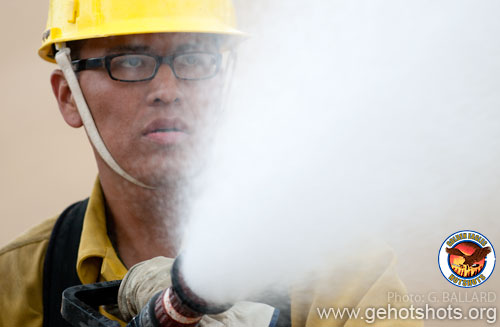 NATIVE AMERICAN INDIAN: Recruit Armstrong (Fort Apache-White Mountain Indian Reservation) sprays a fog stream during his turn at nozzle man during a mobile pumping exercise utilizing Sycuan's state-of-the-art Type 3 fire engine and a light weight Wajax® hose used in modern wildland fire suppression.