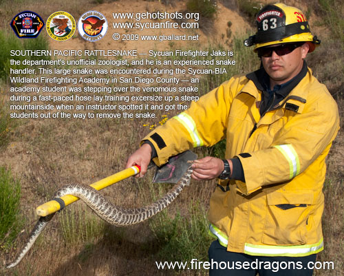 Sycuan Fire Fighter Fred Jaks www.firehousedragons.com removed the poisonous southern Pacific rattlesnake from the training area. DOWNLOAD HIGH-RESOLUTION SNAKE PHOTO.