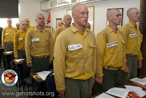 San Diego fire-fighting students posed for professional photo with their BIA-NIFC aviation instructor, Golden Eagles Flycrew instructors, and drill instructors DOWNLOAD 10-INCH FILE.