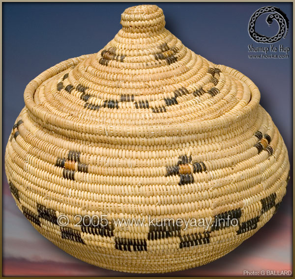 KUMEYAAY BASKET Container With LidFine masterpiece Native American basketry large container basket with lid handweaved by master Kumeyaay basketweavers of San Jose de la Zorra, Baja California, Mexico, fine modern mission Indians basketry baskets. SIZE: Basket Artists: Tanya Carrillo (up to black juncus), Celia Silva top and lid, Kumeyaay Indians, San Jose de la Zorra Kumeyaay baskets may be purchased from Shumup Ko Hup Indian store and gift shop located in Old Town, San Diego. Photo by G BALLARD, San Diego. |