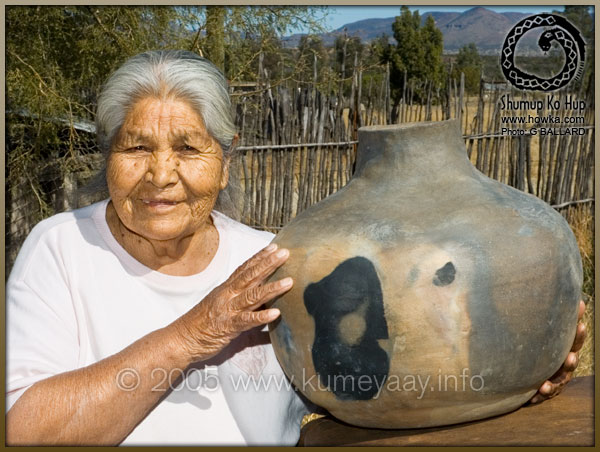 LARGE CALIFORNIA INDIAN OLLACalifornia Indian master pottery artist MANUELA AGUIAR, Pai-Pai Kumeyaay Indian from Santa Catarina tribal village, Baja California, Mexico, poses for a photo with one of her newest coiled clay ollas pottery -- truly unique Native American gift ideas. Manuela, a well known famous California Indigenous artists, was commissioned by a Kumeyaay tribal chairman in San Diego County to create this Native American masterpiece of authentic ethnographic art of the Yuman peoples of California. Special order commissioned ethnographic artwork may be ordered from Manuela Aguair through the SHUMUP KO HUP California Indian store in Old Town San Diego State Historic Park. |