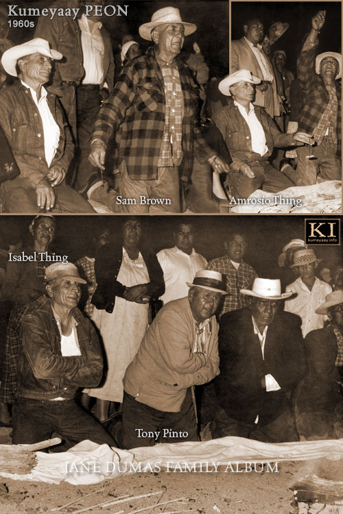 PLAY PEON 1960s Jane Dumas' mother, Isabel and father, Amrosio Thing, play Kumeyaay game "Peon" into the night. Sam Brown (Viejas) and Tony Pinto (Ewiiaapaayp) also identified.