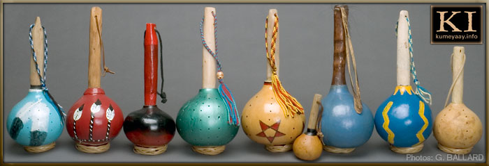 NATIVE RATTLES Making Constructing: Native American rattles, aboriginal musical instruments, are typically constructed of natural gourds, condensed milk cans and evaporated milk cans, desert willow handles, palm seeds to make rattle sounds, agave cord, willow and mole fat handles. Authentic deer-hoof rattles (right above photo) are handmade with twisted agave fiber cord handles and real California deerhoofs, sometimes called deer-toe rattles. Deer-hoof musical and ceremonial rattles are generally played only during Native American funerals and wakes and their dried animal hoofs make a very distinctive sound when shaken. Another type of California Indian rattle is a turtle-shell rattle; it's constructed by sticking a wooden handle through a tortoiseshell, inserting palm seeds and sealing off the openings. The oldest known museum relics of ancient North American rattles are indigenous clay rattles, likely because the clay survived the ages whereas the other organic natural materials deteriorated over time and were lost. SAMUEL BROWN www.kumeyaay.org outlines instructions with photos about how to make a Kumeyaay Indian gourd rattle in Kumeyaay language Sam, a Native speaker, calls the Kumeyaay rattle "HalMa".