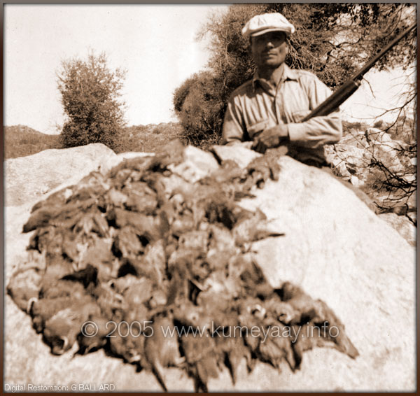 AMBROSIO THING Kumeyaay Guide Translator 1930sJane Dumas' father, Ambrosio Thing, poses with dozens of quail or doves laid out on a rock that he apparently shot on a very successful quail hunt in San Diego County in 1937. Ambrosio Thing was a well known guide and translator for Erle Stanley Gardner on many of Erle Stanley Gardner's Baja California expeditions. Tecate, California, Kumeyaay Nation historical photos, San Diego County historical pictures, Native American Indian hunter hunting in Southern California 1920s 1930s 1940s early 1900s. Dumas family historical Kumeyaay family photographs Contributed by Daleane Dumas-Adams, Jamul Kumeyaay. Digital restorations and design by Gary G. Ballard, San Diego |