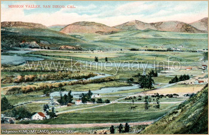 MISSION VALLEY Postcard 1800s 1900sThis historical hand-colored postcard landscape titled "Mission Valley, San Diego, California" was postmarked 1912. The picture documents a turn-of-the-century rural San Diego Mission Valley countryside rich in water with windmills, ranches and dirt roads. KUMEYAAY NATION INDIGENOUS LANDSIn the timeline of KUMEYAAY HISTORY, the turn of the century, this prime ancestral Kumeyaay land, all the Indigenous Kumeyaay coastal lands were under control of the United States Government and the state of California. The surviving Kumeyaay Indians had long been forced into the mountainous San Diego backcountry reservations (map).