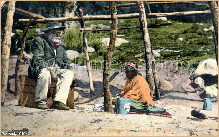 WARNER SPRINGS Postcard 1800s 1900sThis hand-colored antique postcard of Warner Springs in San Diego County was postmarked 1912. The picture documents turn-of-the-century California Indian living conditions in San Diego County. The historical postcard is titled "Indian Camp, Warner Hot Springs, San Diego County, California." ABOUT KUMEYAAY HISTORYThe turn-of-the-century Indigenous Kumeyaay peoples had been psychically and culturally decimated as a result of the European immigration, including the mission periods and the CALIFORNIA GENOCIDE. In the 1910s, when this postcard was made, the surviving Kumeyaay Native American Indian people were seeking peace and refuge in the harsh San Diego mountain desert backcountry, the only remaining ancestral Kumeyaay tribal lands left for them. PRE-CONTACT KUMEYAAY NATION, 1769, it is estimated the aboriginal California Indian population was over 150,000 strong up until which time the Kumeyaay Nation was thriving in what became San Diego County and northern Baja California, Mexico the Kumeyaay were living off the land in harmony with nature, developing their unique cultures over THOUSANDS of years, including their Yuman languages and vast knowledge of the land, indigenous plants and medicinal herbs. By the time this postcard was published, 1910s, only around 1,000 Kumeyaay Indian people had survived in San Diego County. Please see the KUMEYAAY.INFO CALIFORNIA INDIAN RESEARCH DEPARTMENT. |