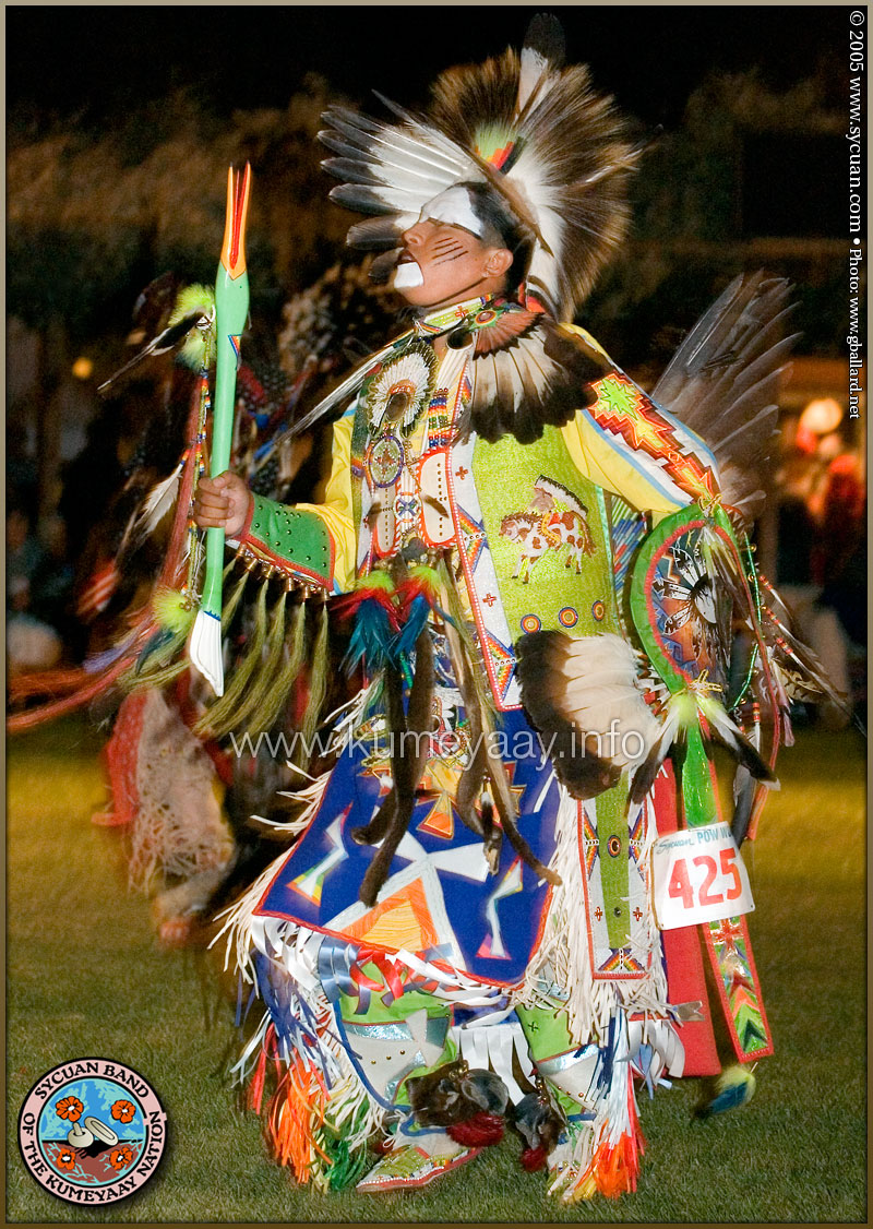 POW WOW Dancer Professional PicturesPow-wow dancer in colorful Native American Indian regalia performs at the Sycuan Powwow in Southern California, San Diego. Dancer carries a Native American staff or war club carved like a duck and painted green with yellow bill and red tongue. Beaded moccasins, tribal and horses motifs, prayer feathers fan, painted shield, feather bustle, breast plates.... Powwow and Photography Sponsored by: