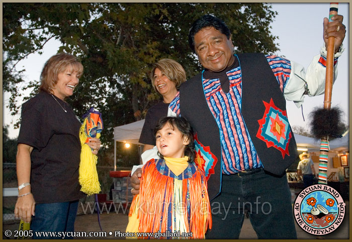 DAN TUCKER Sycuan KumeyaayDan Tucker Sycuan Kumeyaay chairman holds the Sycuan tribal staff and poses with a young Kumeyaay tribal powwow dancer just prior to a Grand Entry opening ceremony on the Sycuan reservation. Pow wow and Photography Sponsored by: