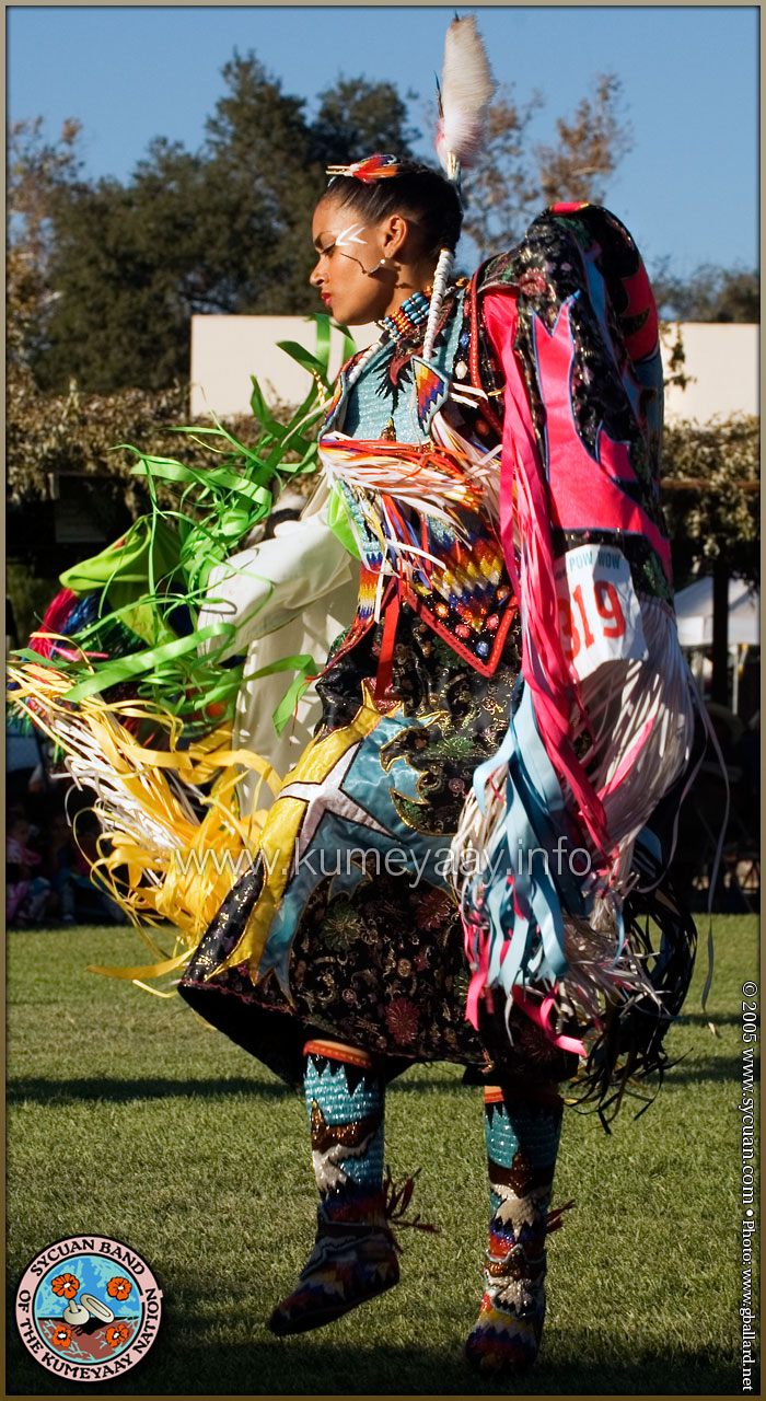 FEMALE DANCER Beautiful American Indian RegaliaBeautiful female dancer dancing image in colorful Native American Indian pow-wow regalia photo, from face paint and feathered hair clips, down to flowing fancy shawl, ornately embroidered vest and skirt with colorful tribal motifs, to her moccasin patterns eagle motifs feather patterns and bright rainbow colors. Pow wow and Photography Sponsored by: