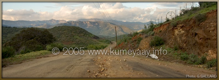 ROADWAY INTO SAN JOSE DE LA ZORRAThe roads into the Kumeyaay Indian Community of San Jose de la Zorra are unpaved dirt, rocky and eroded, they wind through miles of what at times seems like mountainous high desert wilderness a scenic beautiful unforgiving countryside. Rains will flood and washout the roads... Photos, Writing and Web Page Design Contributed by webmaster, GARY G BALLARD, San Diego. |