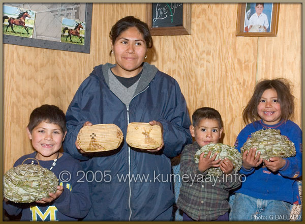 KUMEYAAY INDIAN FAMILY BASKETRYKumeyaay basketweaver Janet Salazar Carrillo poses with her three children, Luis Serrato Salazar, Jose Garcia Salzar, and Eva Garcia Salazar. The children are holding miniature acorn storage baskets woven by Janet with fresh willow. The willow repels the insects that bore into the acorns. Janet is holding two coiled juncus gift baskets. The basket on the left was woven in 199x and the basket on the right was woven in 200x. The basket on the right has two deer woven with red/brown basal juncus. To buy purchase this Kumeyaay Indian artist's authentic San Jose de la Zorra Kumeyaay Indian baskets basketry, her traditional arts and crafts, please visit the Shumup Ko Hup "Dream Come True" Indian store in Old Town State Historic Park, San Diego, California.