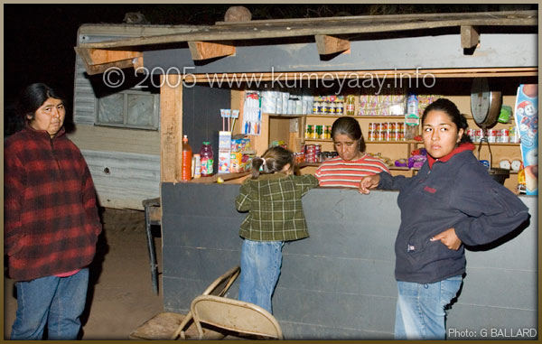 KUMEYAAY STOREVirginia Melendrez (behind counter) runs the local Kumeyaay store in San Jose de la Zorra. Kumeyaay Indian women Tina Vega (left) and Diana Carrillo (right) are pictured in front of the Indian store. The store interior is lighted at night by a single oil lamp. San Jose de la Zorra Kumeyaay Indigenous Community on-line documentary, Kumeyaay photos pictures of Kumiai basket weavers, basketweaving, overall documentary style photo documentation of the village inhabitants, habitations. Photos, Writing and Web Page Design Contributed by webmaster, GARY G BALLARD, San Diego. |