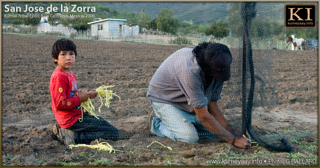 RANCH WORK Farming Lifestyle SeriesIndigenous working ranch lifestyle farming gallery series pictures a young Kumiai Indian boy helping his grandfather build a nylon net fence around one of their newly planted fields to keep hungry animals away from their planted crops. Photos, Writing and Web Page Design Contributed by webmaster, GARY BALLARD, San Diego. |