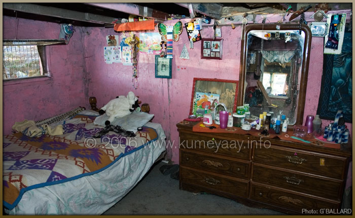 SANTA CATARINA Indian BedroomPai Pai and Kiliwa married couple's bedroom on the Santa Catarina tribal community in Baja California, Mexico. Photos, Writing and Web Page Design Contributed by webmaster, GARY G. BALLARD To buy purchase authentic Santa Catarina Paipai Kumeyaay Indian arts and crafts, please visit the Shumup Ko Hup "Dream Come True" Indian store in Old Town State Historic Park, San Diego, California. |