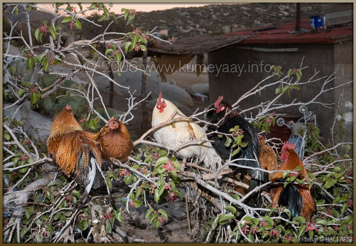 INDIAN CHICKENSIndian chickens in the Indigenous tribal community of Santa Catarina, Baja California, Mexico, are pictured roosting in a tree just after sunset in the rural Mexican Indian rancho. Photos, Writing and Web Page Design Contributed by webmaster, GARY G. BALLARD |