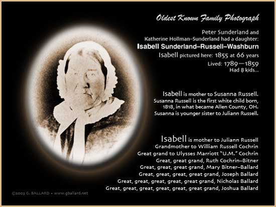 Peter Sunderland and Katherine HollmanSunderland had a daughter: This graphic is part of a 200-photo, 45-minute video documentary on one of the first white families to homestead northwest Ohio in the early 1800s, the Great Black Swamp, Defiance Trail, Auglaize River, Scott's Crossing, Lima, Elida, Delphos area. A 30-minute version of the documentary and more than 20 of the restored vintage 1800s 1900s historical photographs may be viewed HEREgballard.net The free on-line documentary also contains an in-depth 2002 interview of a 76-year-old elder woman which connects the Treaty of Greenville 1795, Indian Removal Act 1830, and Trail of Tears (late 1830s) to her family oral history. |