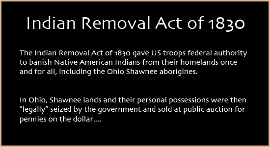 To learn more about the Indian Removal Act of 1830, please go HEREpbs.org. This graphic is part of a 200-photo, 45-minute video documentary on one of the first white families to homestead northwest Ohio in the early 1800s, the Great Black Swamp, Defiance Trail, Auglaize River, Scott's Crossing area. This graphic is part of a 200-photo, 45-minute video documentary on one of the first white families to homestead northwest Ohio in the early 1800s, the Great Black Swamp, Defiance Trail, Auglaize River, Scott's Crossing, Lima, Elida, Delphos area. A 30-minute version of the documentary and more than 20 of the restored vintage 1800s 1900s historical photographs may be viewed HEREgballard.net The free on-line documentary also contains an in-depth 2002 interview of a 76-year-old elder woman which connects the Treaty of Greenville 1795, Indian Removal Act 1830, and Trail of Tears (late 1830s) to her family oral history. |