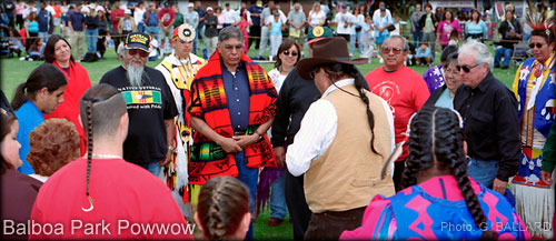 Iipay Indian Ron Christman, Iipay Nation of Santa Ysabel (in tan vest) speaks on behalf of Hank Murphy during a public Kumeyaay honoring ceremony in Balboa Park pow wow in 2002 . Kumeyaay elder Jane Dumas, Jamul Indian Village • a Kumeyaay Nation, was also honored during this famous California Indian cultural event in San Diego.