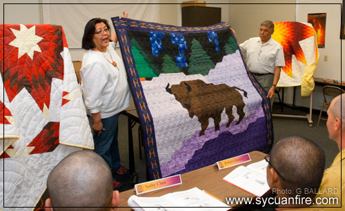 Madam President Fire Thunder presented a beautiful buffalo Lakota Indian blanket to Chief Murphy during the 2008 Sycuan-BIA Wildland Fire Academy on the Sycuan Indian Reservation as Sycuan fire academy cadets look on and learn firsthand about Native American culture and tradition.